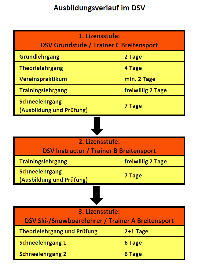 Die Ausbildung zum Übungleiter bzw. Ski- und Snowboardlehrer erfolgt auf Bund- und Landesebene. Der Ausbildungsverlauf ist dabei in drei Lizenzstufen unterteilt.